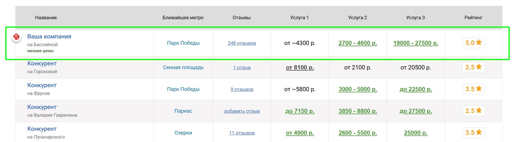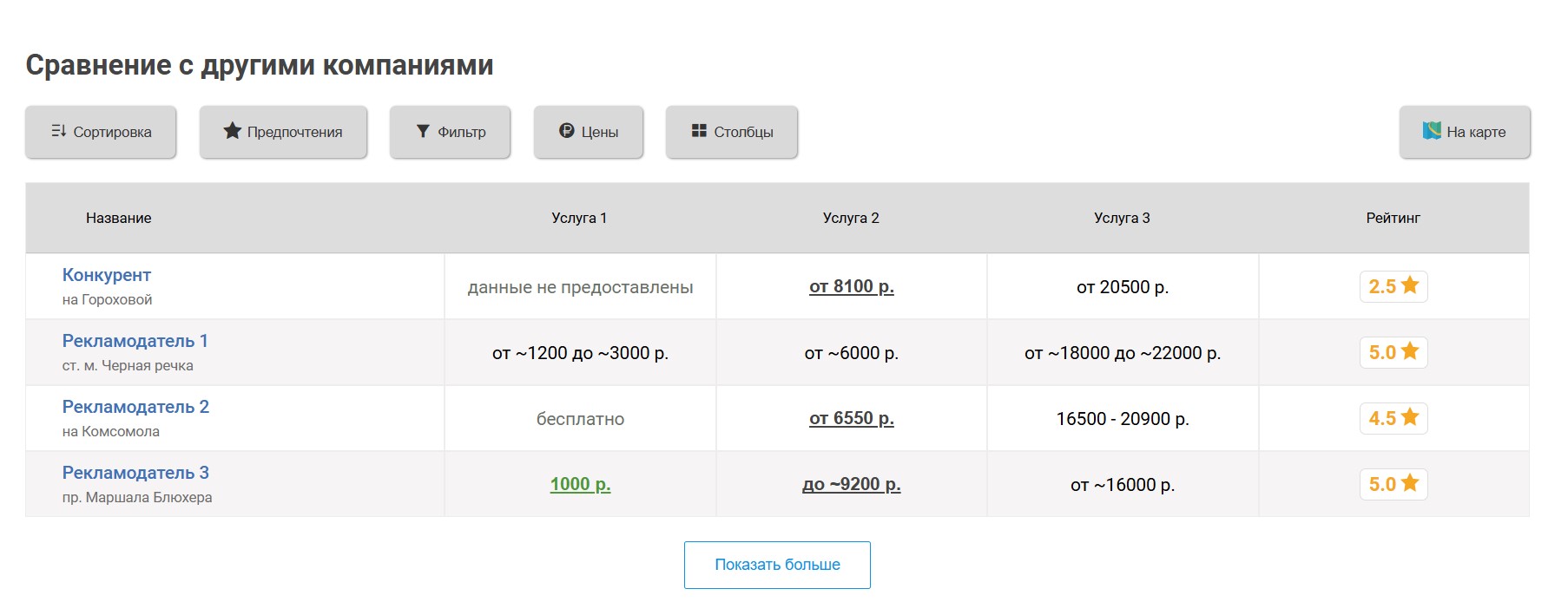 Вокруг продвигаемого таким образом детского сада выбирается некоторое количество ближайших конкурирующих детских садов, продвигаемый детский сад попадёт к ним в таблицу «Сравнение по ценам», которая выглядит следующим образом: